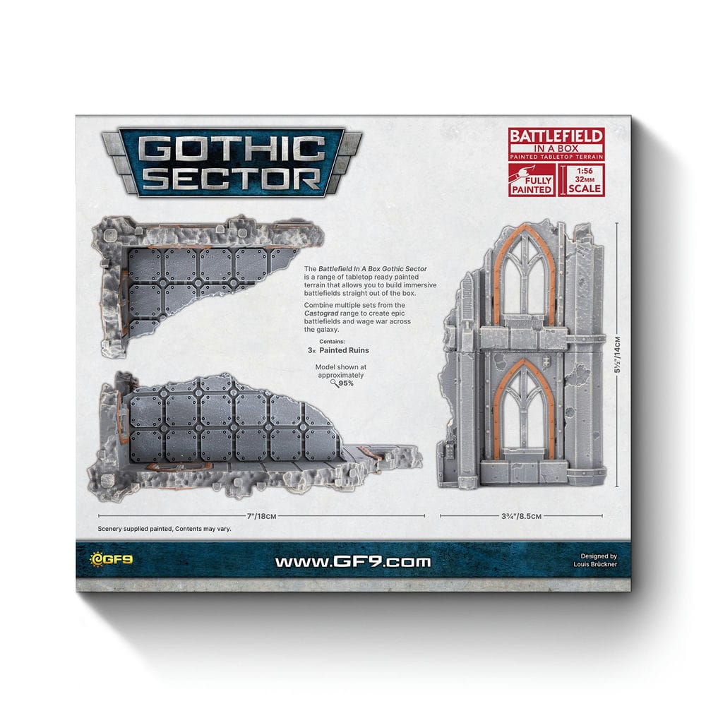 - The Battlefield in Box Gothic Sector ist eine Reihe von fertig bemaltem Tabletop Gelände, das es dir ermöglicht, eindrucksvolle Schlachtfelder direkt aus der Schachtel zu bauen. Kombiniere mehrere Sets aus dem Sortiment, um epische Schlachtfelder zu schaffen und Krieg in der ganzen Galaxie zu führen.