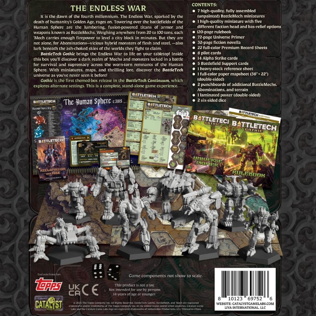 - BattleTech Gothic erweckt den Endlosen Krieg auf Ihrem Tisch zum Leben! In dieser Box entdecken Sie ein düsteres Reich voller Mechs und Monster, die in einem Kampf um Überleben und Vorherrschaft in den vom Krieg zerrütteten Überresten der Menschheitssphäre gefangen sind. Mit Miniaturen, Karten und spannender Hintergrundgeschichte entdecken Sie das BattleTech-Universum, wie Sie es noch nie zuvor gesehen haben!