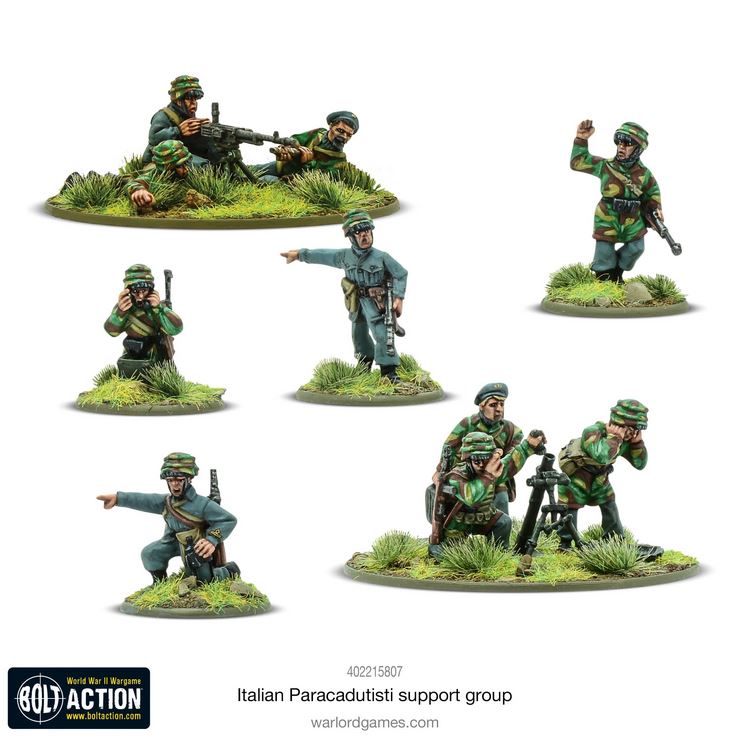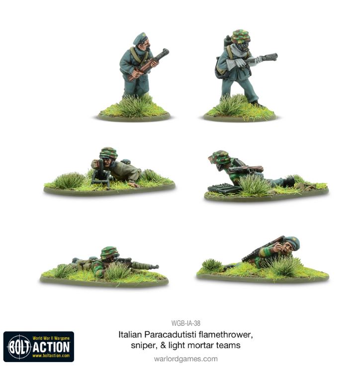 - 1x Italian Paracadutisti Flamethrower, Sniper & Light Mortar Teams 28mm
