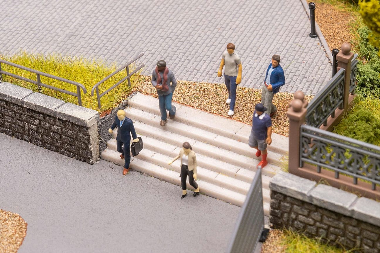 - Geschäftiges Treiben in der Stadt! Sechs Figuren sind unterwegs – auf dem Weg zur Arbeit, zum Einkaufen oder einfach nach Hause. In legerer oder geschäftlicher Kleidung steigen sie die Treppe hinab, jeder in seinem eigenen Tempo. Ob sportlich, entspannt oder elegant – dieses Set bringt Leben in jede Stadtszene und erzählt kleine Geschichten aus dem ganz normalen Tag zwischen Büro, Freizeit und Begegnungen unterwegs.