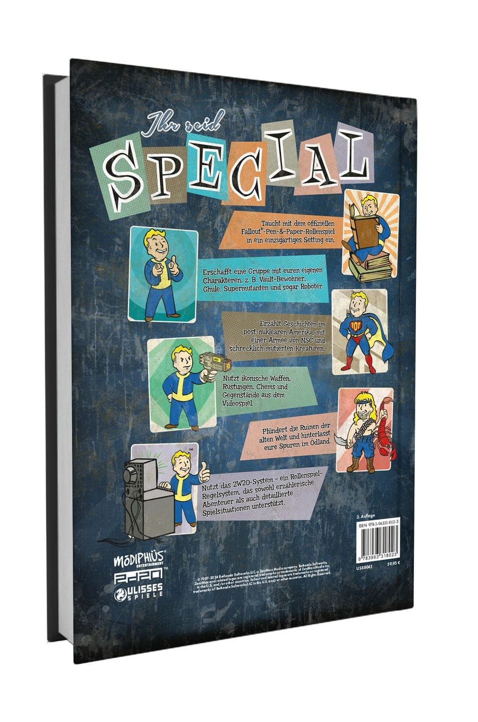 - Dieses 438-seitige Regelbuch enthält Regeln und Hintergrundwissen für Rollenspiele in der Fallout-Welt sowie Konzeptzeichnungen aus den Fallout-Videospielen und ein Start-Abenteuer.
