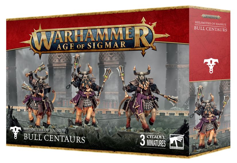 Die Stierzentauren können mit einer Auswahl von vier verschiedenen Hörnerpaaren gebaut werden, während die Gesalbten Wächter aus drei einzigartigen Masken wählen können. Der Bausatz enthält außerdem ein Abziehbilderbogen der Helschmiede des Hashut mit 450 Abziehbildern, um deine Miniaturen individuell zu gestalten.