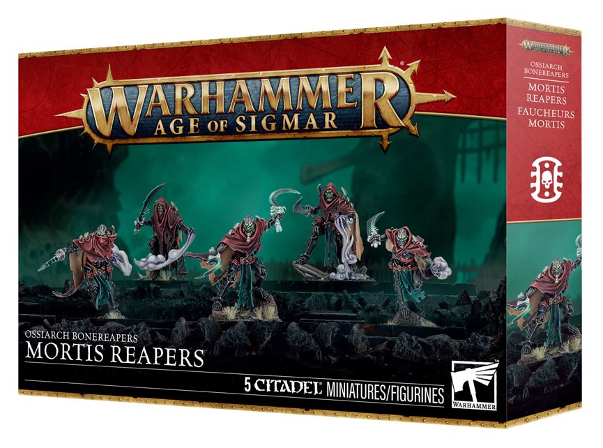 Mortis-Schnitter sind gefürchtete und unerbittliche Assassinen, die mit übernatürlicher Geschwindigkeit zwischen die feindlichen Reihen springen, um verwundbare und einflussreiche Anführer gezielt auszuschalten. Ein flirrendes Hitzeflimmern umgibt ihre Gestalten, während sie tödliche Nekrospeicher führen. Dem grausamen Knochentribut, das sie im Namen ihrer Legionen einfordern, kann niemand entkommen.